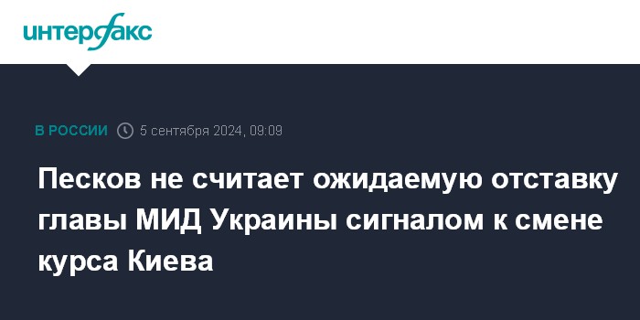 Москва. 4 сентября. INTERFAX.RU - Ожидаемая отставка главы МИД Украины Дмитрия Кулебы не является сигналом смены внешнеполитического курса Украины, заявил "Интерфаксу" пресс-секретарь президента РФ Дмитрий Песков.