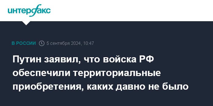 Москва. 5 сентября. INTERFAX.RU - Президент РФ Владимир Путин заявил, что в результате успешных наступательных действий российские войска обеспечили территориальные приобретения, которых не было уже давно.