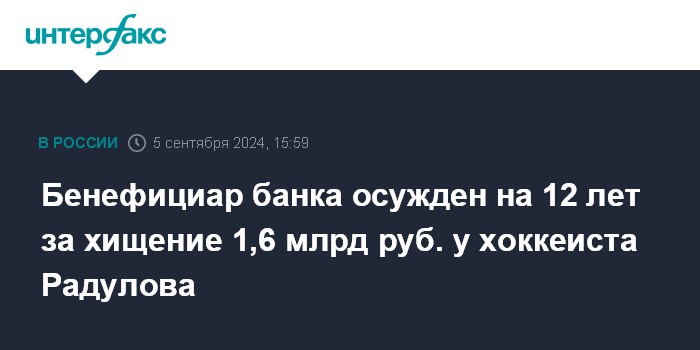 Бенефициар банка осужден на 12 лет за хищение 1,6 млрд руб. у хоккеиста Радулова