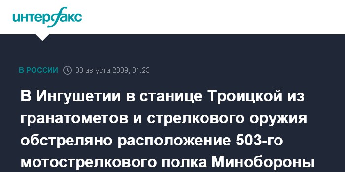 Назрань. 30 августа. ИНТЕРФАКС-ЮГ - Неизвестными лицами из гранатометов и стрелкового оружия обстреляно расположение 503-го мотострелкового пока 58 армии Минобороны РФ, расквартированного в Ингушетии в станице Троицкой.