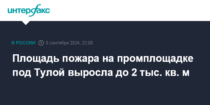 Москва. 5 сентября. INTERFAX.RU - МЧС России сообщило об увеличении площади пожара на промплощадке в Узловой Тульской области до 2 тыс. кв. метров.