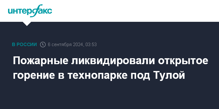 Москва. 6 сентября. INTERFAX.RU - МЧС России сообщило о ликвидации открытого горения в технопарке в Узловском районе Тульской области, пострадавших нет.
