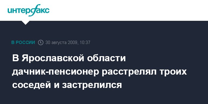 Москва.30 августа. INTERFAX.RU - В деревне Липовицы Некрасовского района Ярославской области пенсионер застрелил на своем приусадебном участке троих соседей, а потом покончил жизнь самоубийством, сообщил "Интерфаксу" в воскресенье источник в правоохранительных органах.