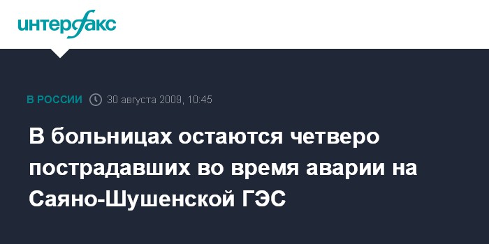 Саяно-Шушенская ГЭС (Хакасия). 30 августа. INTERFAX.RU - Четверо пострадавших во время аварии на Саяно-Шушенской ГЭС 17 августа продолжают оставаться в больницах, сообщила в воскресенье на пресс-конференции заместитель председателя правительства Хакасии Ирина Смолина.