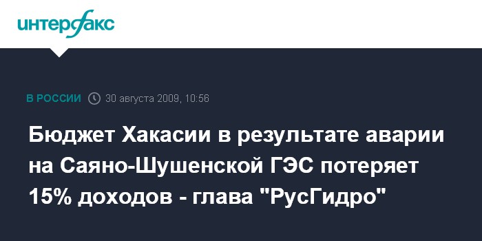 Бюджет Хакасии в результате аварии на Саяно-Шушенской ГЭС потеряет 15% доходов - глава "РусГидро"