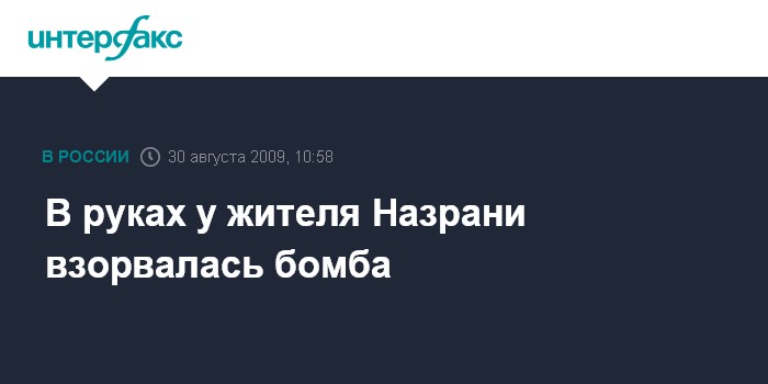 Москва. 30 августа. INTERFAX.RU - Житель Назрани нашел на своем приусадебном участке предмет, который взорвался у него в руках, сообщил "Интерфаксу" источник в правоохранительных органах.