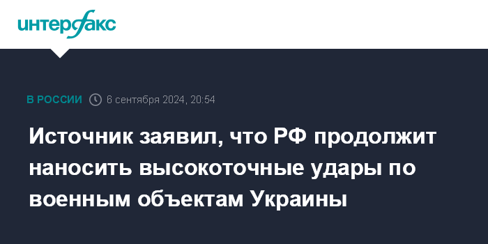 Москва. 6 сентября. INTERFAX.RU - Российская армия на прошедшей неделе нанесла серию высокоточных ударов по ВСУ и украинским военным объектам, такие удары будут наноситься регулярно, заявил в пятницу высокопоставленный российский военный источник.