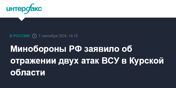 Москва. 7 сентября. INTERFAX.RU - Российские военные отразили за сутки на курском направлении две атаки украинских штурмовых групп, сообщило Минобороны РФ в субботу.