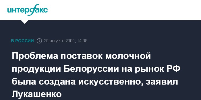 Логойск (Минская область).30 августа. INTERFAX.RU - Президент Белоруссии Александр Лукашенко заявил, что возникшие ранее проблемы с поставками молочной продукции в Россию способствовали поиску новых рынков сбыта белорусского продовольствия.