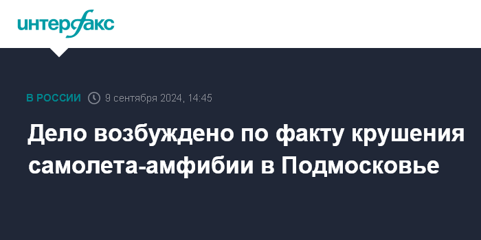 Москва. 9 сентября. INTERFAX.RU - Уголовное дело возбуждено в связи с гибелью экипажа самолета-амфибии при крушении под Рузой в Московской области, сообщает телеграм-канал Западного межрегионального управления на транспорте Следственного комитета РФ (СКР).
