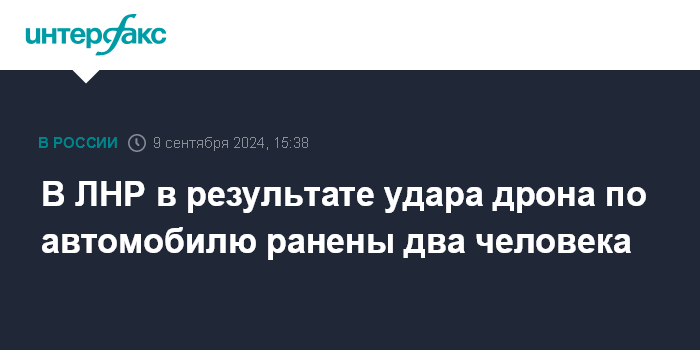 Москва. 9 сентября. INTERFAX.RU - В городе Приволье в Луганской народной республике ударный беспилотник ВСУ атаковал автомобиль, в результате были ранены находившиеся в машине мужчина и женщина, сообщили в администрации Лисичанска.
