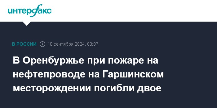 Москва. 10 сентября. INTERFAX.RU - В Курманаевском районе Оренбургской области произошел пожар на нефтепроводе, погибли два человека, сообщила прокуратура региона.