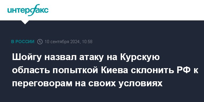 Москва. 10 сентября. INTERFAX.RU - Секретарь Совбеза РФ Сергей Шойгу заявил, что атака на Курскую область является попыткой Украины склонить Россию к переговорам на своих условиях.