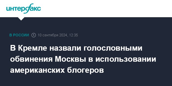 Москва. 10 сентября. INTERFAX.RU - Пока Вашингтон не назовет имена блогеров, которых якобы использует Россия для влияния на общественное мнение в США, эти обвинения останутся голословными, заявил пресс-секретарь президента Дмитрий Песков.