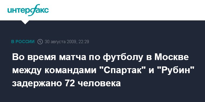 Москва. 30 августа. ИНТЕРФАКС-МОСКВА - За нарушение общественного порядка во время проведения матча Чемпионата России по футболу между командами "Спартак" и "Рубин", который проходил в воскресенье на стадионе "Лужники", задержано 72 человека, сообщил дежурный офицер Управления информации и общественных связей ГУВД Москвы Геннадий Богачев.