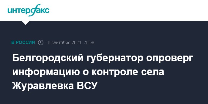 Москва. 10 сентября. INTERFAX.RU - Губернатор Белгородской области Вячеслав Гладков назвал недостоверной информацию о контроле вооруженными силами Украины (ВСУ) села Журавлевка Белгородского района.