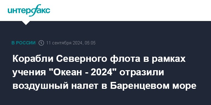 Москва. 11 сентября. INTERFAX.RU - В рамках стратегического командно-штабного учения "Океан - 2024" корабельная поисково-ударная группа Северного флота отразила воздушный налёт условного противника в акватории Баренцева моря, сообщили в Минобороны РФ.