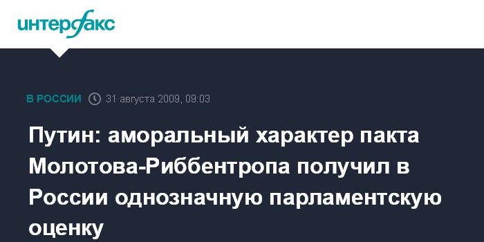 Москва. 31 августа. INTERFAX.RU - Премьер-министр РФ Владимир Путин заявил, что пакт Молотова-Рибентроппа несомненно заслуживает осуждения, но призывает не вырывать искусственно отдельные эпизоды из общего исторического фона, политико-экономического или военно-стратегического контекста.