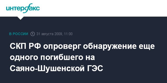 Москва. 31 августа. INTERFAX.RU - СКП РФ не подтвердил появившиеся в понедельник в ряде СМИ сообщения об обнаружении 73-го погибшего в результате аварии на Саяно-Шушенской ГЭС.