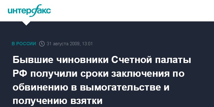 Москва. 31 августа. INTERFAX.RU – Мосгорсуд приговорил на сроки от четырех до восьми лет строгого режима бывших чиновников Счетной палаты РФ, которых присяжные признали виновными в вымогательстве, а затем и получении взятки в 120 тыс. долларов.