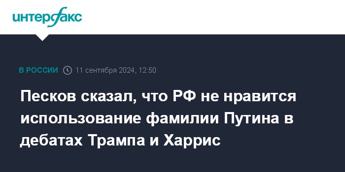 Песков сказал, что РФ не нравится использование фамилии Путина в дебатах Трампа и Харрис
