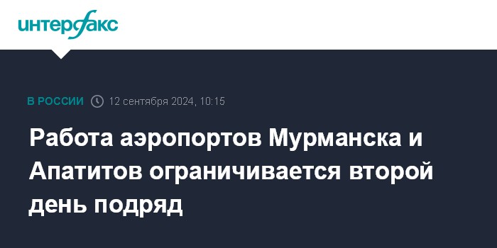 Москва. 12 сентября. INTERFAX.RU - Работа аэропортов Мурманска и Апатитов ("Хибины") ограничена с 9:35 мск в четверг, сообщила Росавиация.
