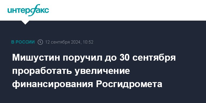 Москва. 12 сентября. INTERFAX.RU - Премьер-министр Михаил Мишустин поручил ведомствам до 30 сентября проработать вопрос об увеличении финансирования Росгидромета в рамках подготовки нового национального проекта "Экологическое благополучие", сообщает пресс-служба правительства.