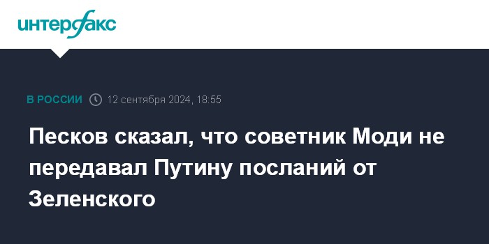 Отвечая на вопрос, передавал ли советник Моди какие-то слова Путину от Зеленского, Песков ответил: "нет".