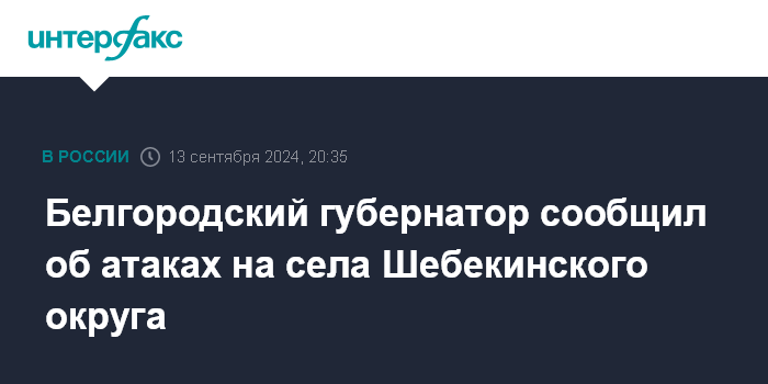Москва. 13 сентября. INTERFAX.RU - Губернатор Белгородской области Вячеслав Гладков сообщил в Telegram об украинских атаках на Шебекинский городской округ. По предварительным данным, обошлось без пострадавших.