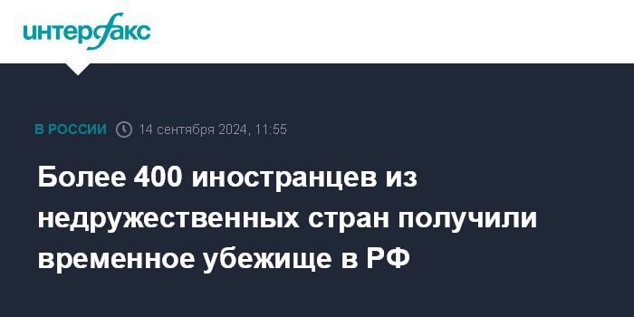 Москва. 14 сентября. INTERFAX.RU - Временное убежище в России получили свыше 400 иностранных граждан из недружественных стран, "которым близки духовные и культурные ценности нашей страны", заявили в пресс-службе МВД России в субботу.