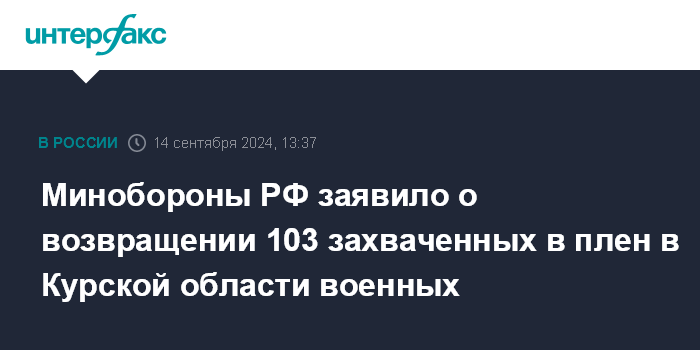Москва. 14 сентября. INTERFAX.RU - В министерстве обороны РФ сообщили о возвращении 103 российских военнослужащих, захваченных в плен в Курской области, Украине переданы 103 военнопленных ВСУ.