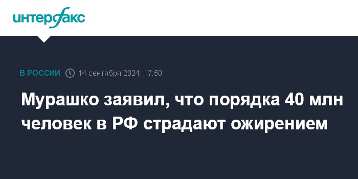 Москва. 14 сентября. INTERFAX.RU - В России около 40 млн человек страдают ожирением, сообщил министр здравоохранения РФ Михаил Мурашко журналистам в субботу.