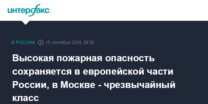 Москва. 15 сентября. INTERFAX.RU - Высокая пожарная опасность сохраняется на территории европейской части России из-за жары, в Москве - чрезвычайный класс, сообщил "Интерфаксу" научный руководитель Гидрометцентра России Роман Вильфанд.