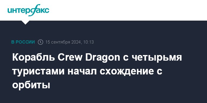 Москва. 15 сентября. INTERFAX.RU - Американский многоразовый космический корабль Crew Dragon в воскресенье после пятидневного коммерческого орбитального полета начал схождение с орбиты, сообщила компания-разработчик SpaceX.