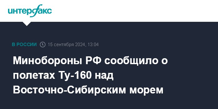Москва. 15 сентября. INTERFAX.RU - Два российских стратегических ракетоносца Ту-160 выполнили полет над нейтральными водами Восточно-Сибирского моря в рамках стратегического командно-штабного учения (СКШУ) "Океан-2024", сообщили в Минобороны РФ в воскресенье.