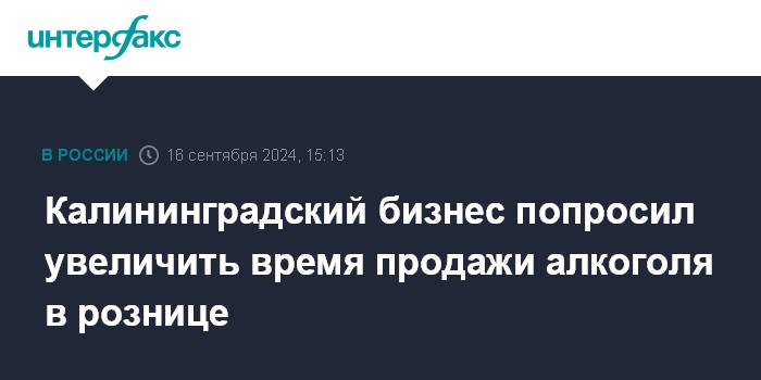 Москва. 16 сентября. INTERFAX.RU - Предприниматели Калининградской области выступают за увеличение времени продажи спиртного в точках розничной торговли, сообщила пресс-служба региональной Торгово-промышленной палаты.