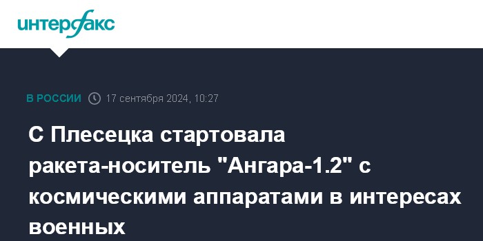 Москва. 17 сентября. INTERFAX.RU - С космодрома Плесецк выполнен пуск легкой ракеты-носителя "Ангара-1.2" с космическими аппаратами в интересах военных, сообщили в Минобороны РФ.