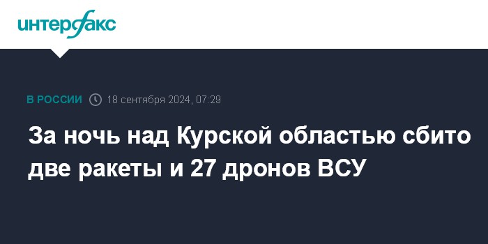 Москва. 18 сентября. INTERFAX.RU - Врио губернатора Курской области Алексей Смирнов сообщил, что система ПВО сбила за ночь 27 беспилотников ВСУ и две украинские ракеты над регионом.