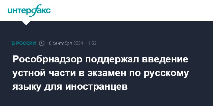 Москва. 18 сентября. INTERFAX.RU - Рособрнадзор поддерживает инициативу ввести устную часть в экзамен по русскому языку для иностранных граждан, желающих работать в России, сообщили в пресс-службе ведомства.