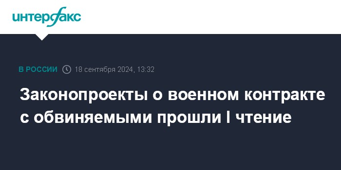 Москва. 18 сентября. INTERFAX.RU - Госдума приняла в первом чтении два законопроекта о возможности в период мобилизации или в военное время заключать контракт с обвиняемыми, дела которых находятся в производстве суда первой или апелляционной инстанции.