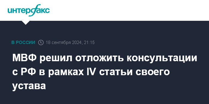 Москва. 18 сентября. INTERFAX.RU - Международный валютный фонд (МВФ) решил отложить проведение консультаций с РФ в рамках IV статьи устава фонда (сбор и обсуждение экономической и финансовой информации страны), которые был намерен возобновить 16 сентября после более чем двухлетней паузы.