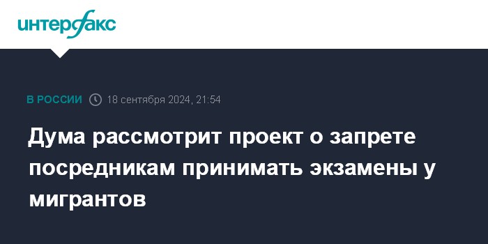 "Предлагаем установить полный запрет для посреднических организаций принимать участие в приеме экзаменов у мигрантов", - сказал Володин в среду в интервью радио "Комсомольская правда".