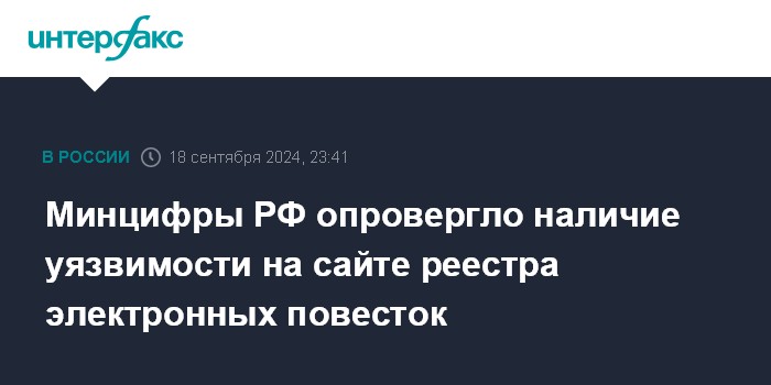 Москва. 18 сентября. INTERFAX.RU - Минцифры России заявило об отсутствии уязвимости на сайте реестра электронных повесток, а также об отсутствии утечек.