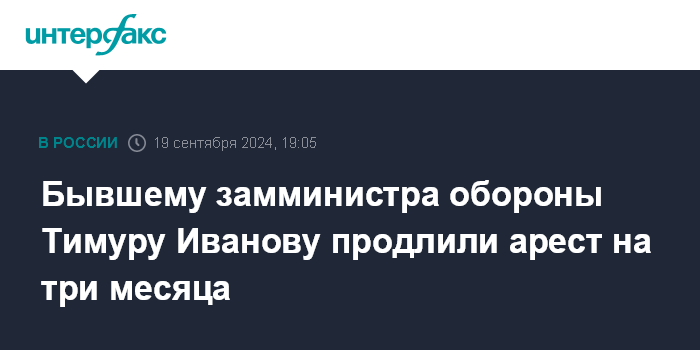 Москва. 19 сентября. INTERFAX.RU - Басманный суд по ходатайству следствия продлил на три месяца - до 23 декабря - арест бывшему заместителю министра обороны Тимуру Иванову, который обвиняется в коррупции, передал корреспондент "Интерфакса". Это решение вынесла судья Евгения Козлова.