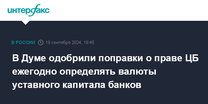 Москва. 19 сентября. INTERFAX.RU - Комитет Госдумы по финансовому рынку поддержал законопроект, который предлагает наделить Банк России полномочием ежегодно определять перечень иностранных валют, которые могут быть внесены в оплату уставного капитала кредитной организации, страховой организации и негосударственного пенсионного фонда (НПФ).