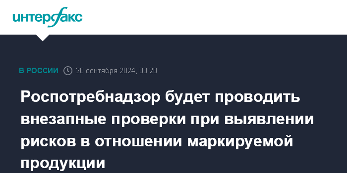 "С 21 сентября 2024 года вступает в силу ряд изменений в постановление Правительства Российской Федерации от 10 марта 2022 г. № 336 "Об особенностях организации и осуществления государственного контроля (надзора), муниципального контроля". В соответствии с изменениями, Роспотребнадзор будет проводить "внезапные проверки" (без уведомления контролируемых лиц) при выявлении индикаторов риска нарушения обязательных требований к продукции, которая подлежит маркировке средствами идентификации", - сообщили журналистам в пресс-службе ведомства.