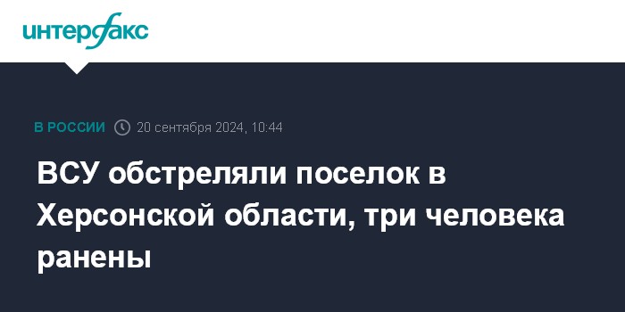 Москва. 20 сентября. INTERFAX.RU - Три человека пострадали в поселке Великая Лепетиха Херсонской области после обстрела со стороны Вооруженных сил Украины, сообщил в пятницу в своем телеграм-канале губернатор региона Владимир Сальдо.