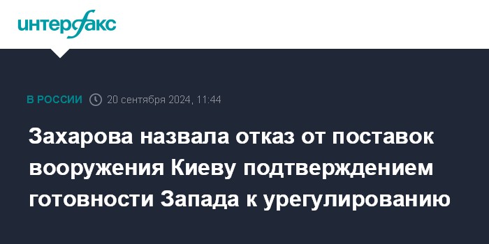 Москва. 20 сентября. INTERFAX.RU - Только отказ поставлять вооружения Украине будет свидетельствовать о готовности Запада к политико-дипломатическому урегулированию, заявила официальный представитель МИД РФ Мария Захарова.