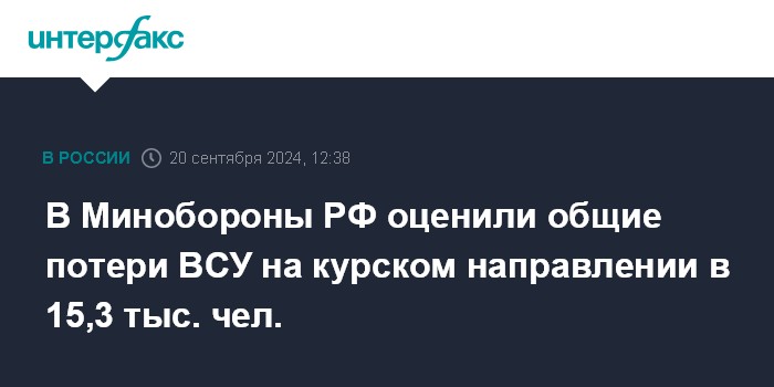 Москва. 20 сентября. INTERFAX.RU - Потери армии Украины за все время боевых действий на курском направлении составили более 15,3 тысяч военнослужащих и 124 танка, заявили в Минобороны РФ в пятницу.