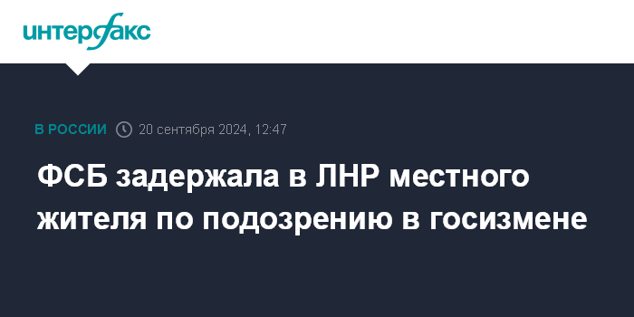 Москва. 20 сентября. INTERFAX.RU - Сотрудники УФСБ РФ по Луганской народной республике задержали жителя Старобельского района по подозрению в госизмене, сообщили журналистам в региональном управлении ФСБ.